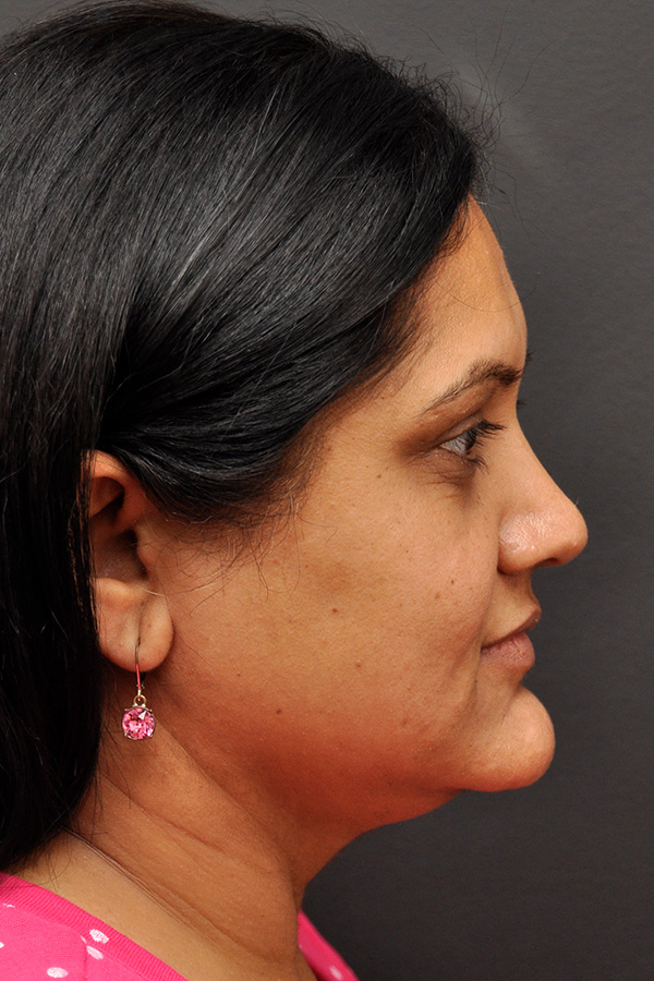 - 40 year old female who was very self conscious about her prominent chin and has wanted it changed her entire life. The chin prominence was created by excess soft tissue (fat) as well as excess bone. She also did not like the heaviness under her chin on profile view. Patient underwent a soft tissue chin reduction with removal of excess fat as well as bony chin reduction with removal of excess bone. A reduction in the size of the chin also requires removal of excess skin after the chin is recessed; this is performed at the same time. Neck liposuction was also performed to reduce the heaviness under her chin simultaneously.