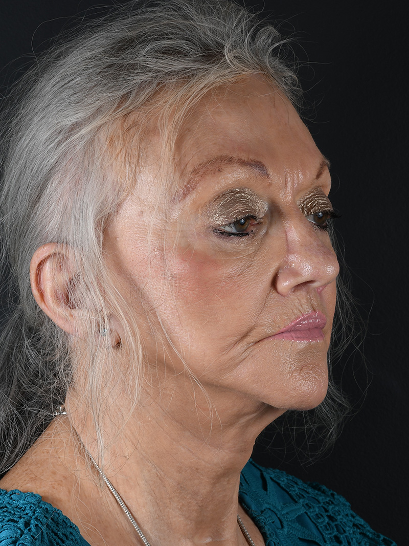 - 74 year old female who was unhappy with a previous facelift performed elsewhere presents because she is still bothered by the puffiness and skin excess in her lower eyelids as well as jowling and loose neck skin present. She is also bothered by some of the heaviness on her upper eyelid as well as a thinner upper lip and lines around her mouth. After images reveal the patient after a lateral browlift, upper blepharoplasty, lower blepharoplasty, modified deep plane facelift with neck lipo, upper lip lift to reduce distance between nose and upper lip and to recreate lip eversion, as well as fat injection for midfacial and lower eyelid hollowing and CO2 laser around the mouth for lipstick lines.