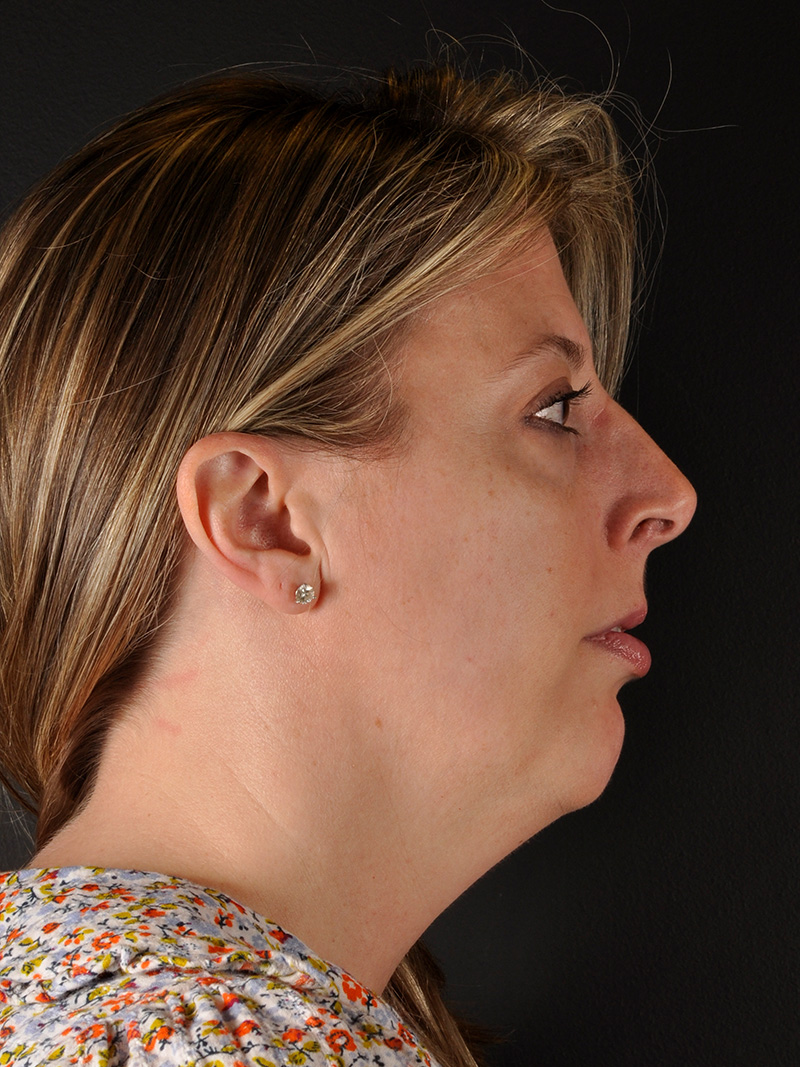 - 42 year old female who desires a better neckline with removal of her double chin, a better jawline with more jawline definition, improved proportion between her chin and lips, and an overall improved profile. The patient has had coolsculpting to chin with little improvement and has had fillers to her chin and jawline to improve her appearance but wants a more permanent option. After images show patient after a chin implant, neck liposuction, as well as Facetite to jawline and neck to contour fat and improve neck and jawline definition.