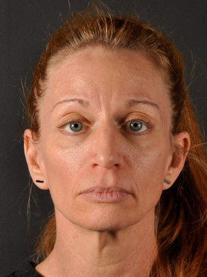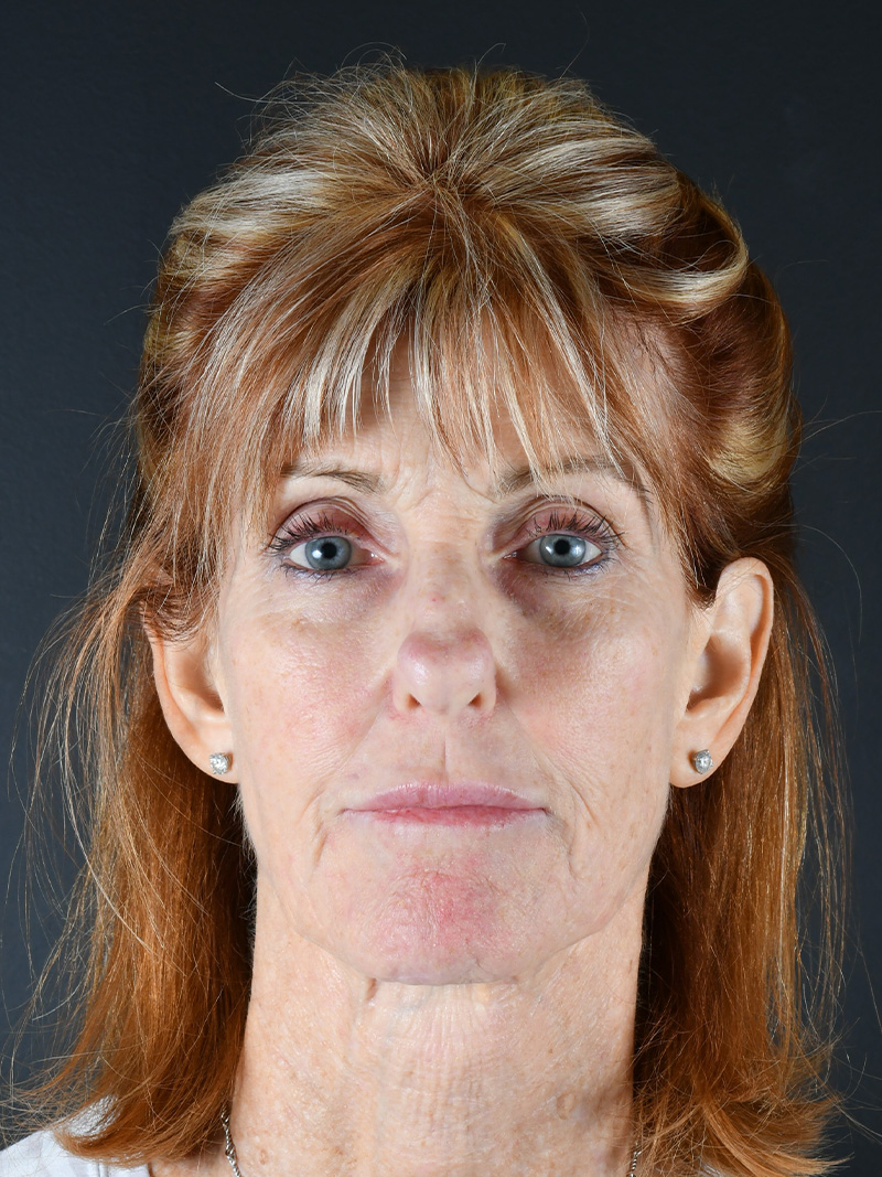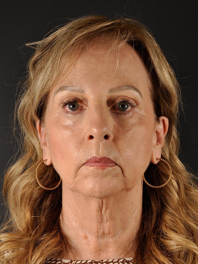 62 year old female who is bothered by the puffiness under her eyes, drooping of her cheeks, heaviness around her mouth and the excess skin in her neck. She notes that she has had filler a long time ago under her eyes. The patient underwent a lateral browlift, lower blepharoplasty, deep plane facelift with neck liposuction to create a smoother neck contour, fat injection to areas around the mouth, CO2 laser to tighten the crepey skin around the eyes, to help with the vertical lines around the lips, and to her nasal pores and an old nasal scar. She was found to have filler under her eyes which was also dissolved at time of surgery.