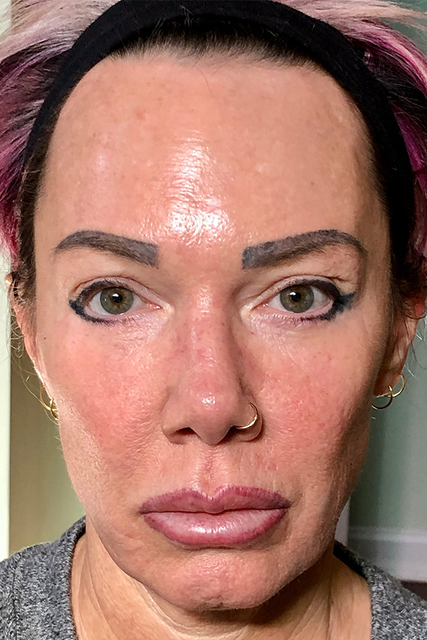 56-year-old female who is bothered by her jowling, neck skin excess, and her elongated ear lobes. The patient underwent a minifacelift to tighten the jawline and neckline, bilateral ear lobe reduction to reduce the size of the ear lobes, and fat transfer to face to treat volume loss in temples, under eyes, midface, around the mouth and chin, and both corners of mouth.